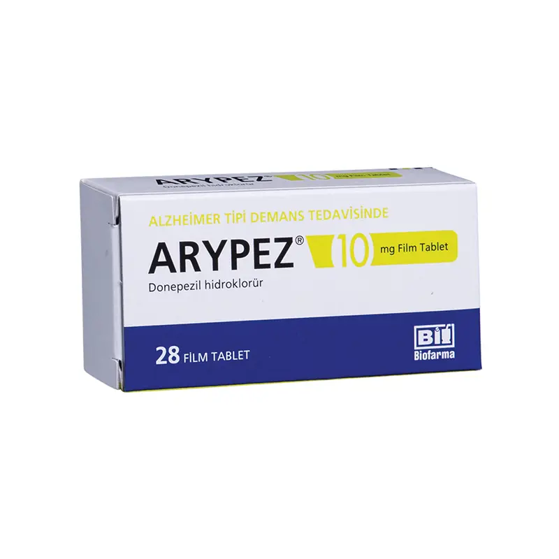 ARYPEZ® (Donepezil hidroklorür) 10 mg film kaplı tabletler, sarı renkte, yuvarlak ve bikonveks şekildedir. Tablet içerisinde sığır sütünden elde edilen laktoz monohidrat bulunmaktadır. Her bir tablet 10 mg donepezil hidroklorür içerir ve 28 tabletlik ambalajlarda sunulmuştur. ARYPEZ® tablet, hafif ve orta şiddetli Alzheimer tipi bunama belirtilerinin tedavisinde kullanılır ve etkin maddesi donepezil hidroklorür, asetilkolinesteraz inhibitörleri olarak anılan bir ilaç sınıfına aittir.