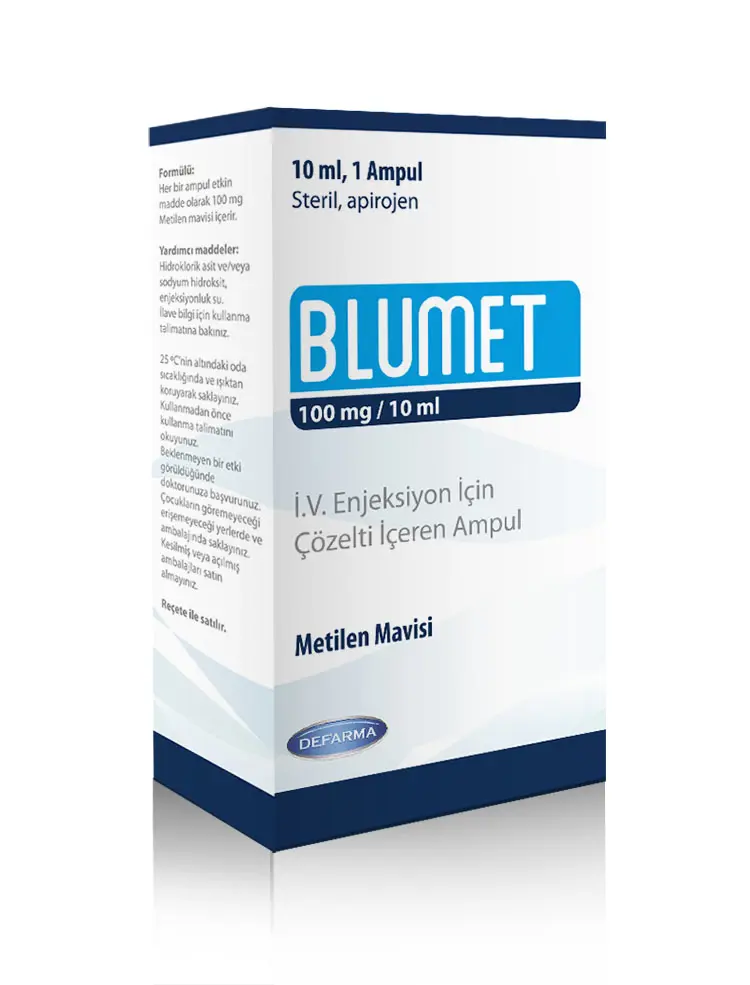 BLUMET hastanede uzmanlaşmış tıbbi personel tarafından kullanılması gereken bir ilaçtır. BLUMET 1 adet 10 ml çözelti içeren tip I renksiz cam ampullerden oluşmaktadır. Her bir ampul etkin madde olarak Metilen mavisi içerir.