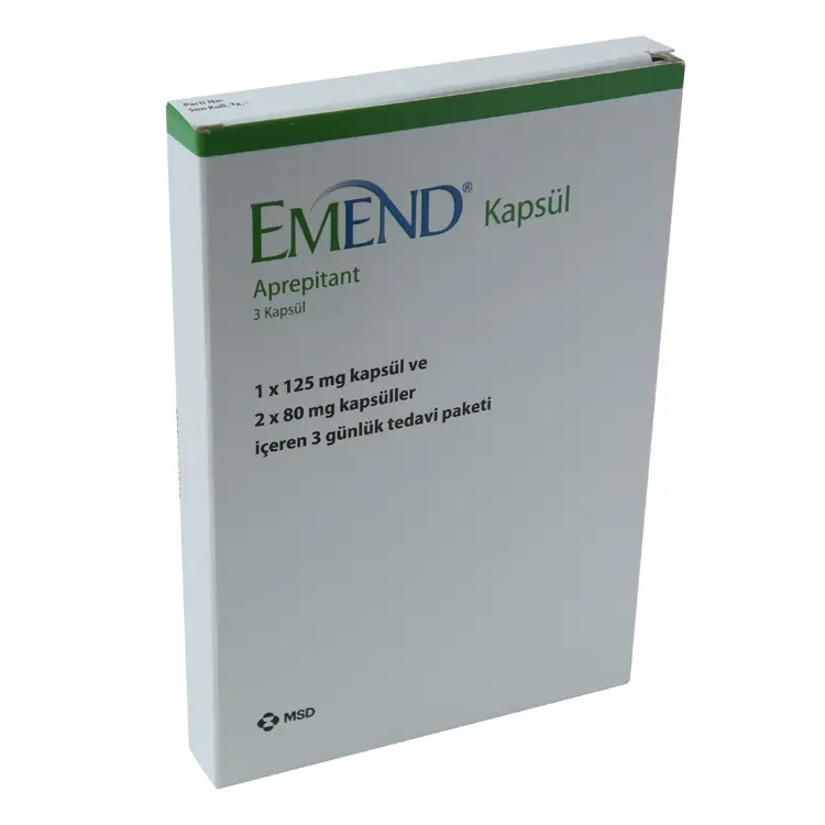 - EMEND 3 günlük tedavi paketinde 3 kapsül içeren blister ambalajlarda kullanıma sunulmaktadır. 3 kapsülden biri 125 mg (pembe-beyaz renkli), diğer ikisi 80 mg (beyaz renkli) aprepitant içerir.