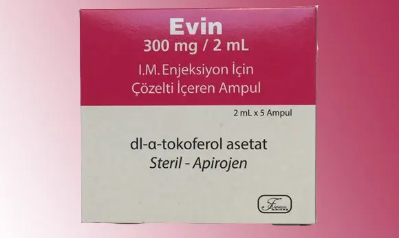 EVİN, E vitamini eksikliği ve yetersizliğine bağlı gelişen durumlarda kullanılır. 2 ml’lik 3, 5, 50 ve 100 ampul içeren karton kutu içinde ambalajlıdır.