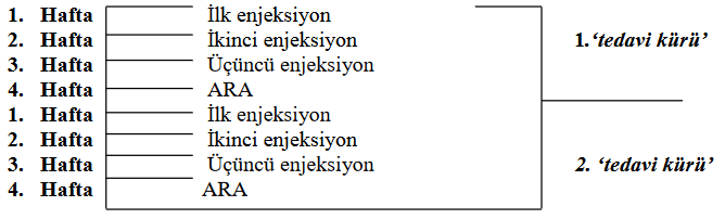 Aşağıdaki şema her biri 3’er enjeksiyon ve 1 kesintiden oluşan arka arkaya iki ‘tedavi kürü’ne örnektir.