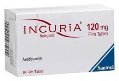 İNCURİA tabletler, çentiksiz, sarı renkli, 120 baskılı, oblong film kaplı tabletlerdir. Her bir film tablet 120 mg nateglinid içerir.