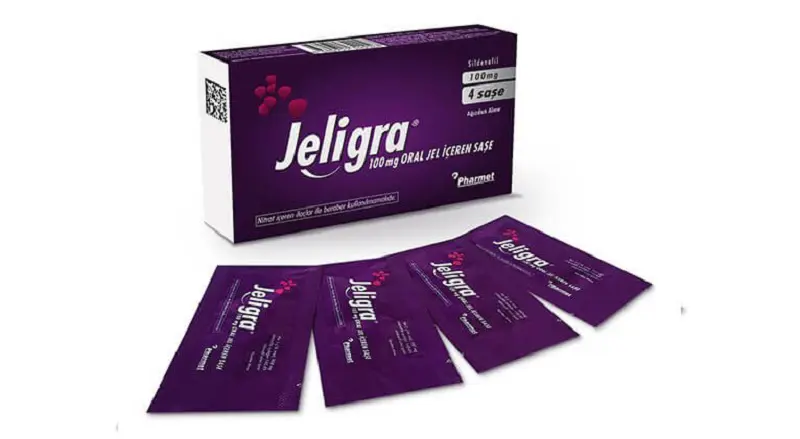 - JELİGRA® 100 mg sildenafil; pembe renkli, çilek aromalı jel içeren 4 adet alüminyum-PE folyo saşe içerisinde sunulmaktadır.