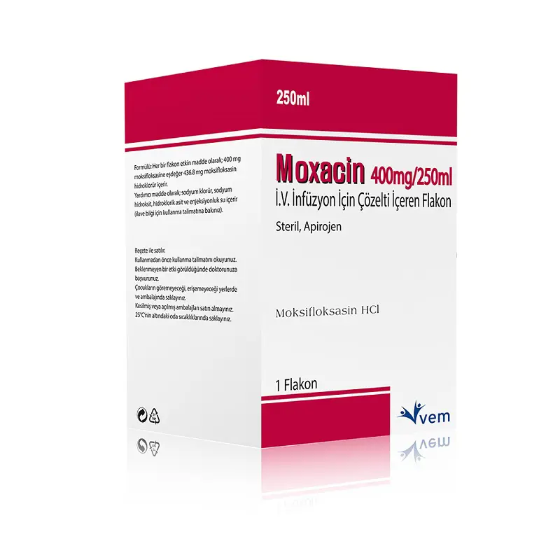 Penisilin, sefalosporin, aminoglikozid, makrolid ve tetrasiklin grubu antibiyotikleri etkisiz kılan direnç mekanizmaları, moksifloksasinin bakteri karşıtı (antibakteriyel) etkisini engellememektedir. - MOXACİN, 250 mililitrelik renksiz cam flakonlar (ilaç şişeleri) içinde kullanıma sunulmaktadır.