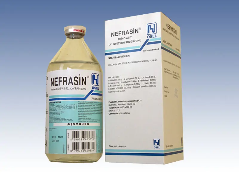NEFRASİN vücut için besleyici maddelerden proteinlerin yapıtaşı olan amino asitleri içeren bir çözeltidir. 500 mililitrelik şişelerde bulunur.