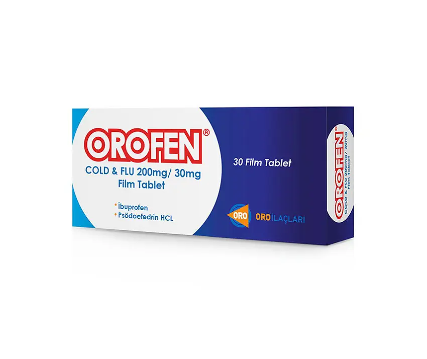 OROFEN COLD & FLU 200 mg / 30 mg, 12, 24 ve 30 tabletlik blister ambalajlarda sunulan bir ilaçtır. OROFEN COLD & FLU 200 mg / 30 mg, etkin madde olarak ibuprofen ve pseudoefedrin içerir.