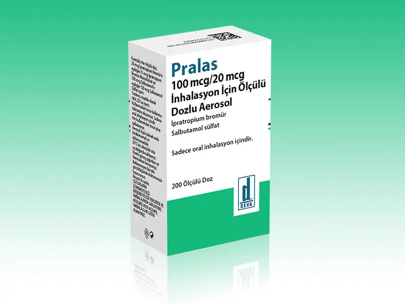 - PRALAS 100 mcg/20 mcg inhalasyon için çözelti içeren ölçülü dozlu aerosol, ağızdan soluyarak (inhalasyon yoluyla) kullanılmak için hazırlanmış, basınçlı bir süspansiyondur. Püskürtüldügünde, havada asılı zerrecikler (aerosol) oluşturur ve akciğerlere bu şekilde ulaşır. İnhalatör denen bir alet ile uygulanır.