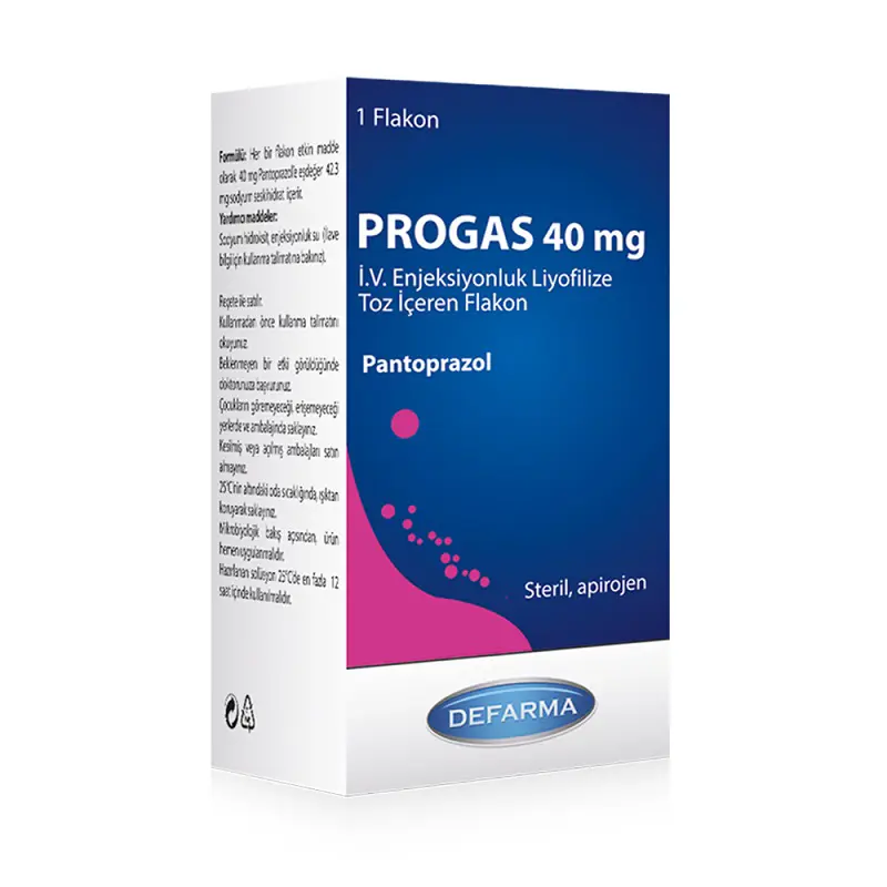 PROGAS enjeksiyonluk çözelti için beyaz - soluk beyaz bir tozdur. 40 mg toz içeren, gri bromobutil kauçuk tıpalı, alüminyum flip-off kapaklı 10 ml renksiz cam flakon içerisinde yer alır. Etken madde olarak pantoprazol içeren PROGAS, “proton pompası inhibitörü” olarak bilinen ilaçlardan biridir. Midenizde asit oluşumunu azaltır. Midede asit nedeniyle oluşan hastalıkların tedavisinde kullanılır.