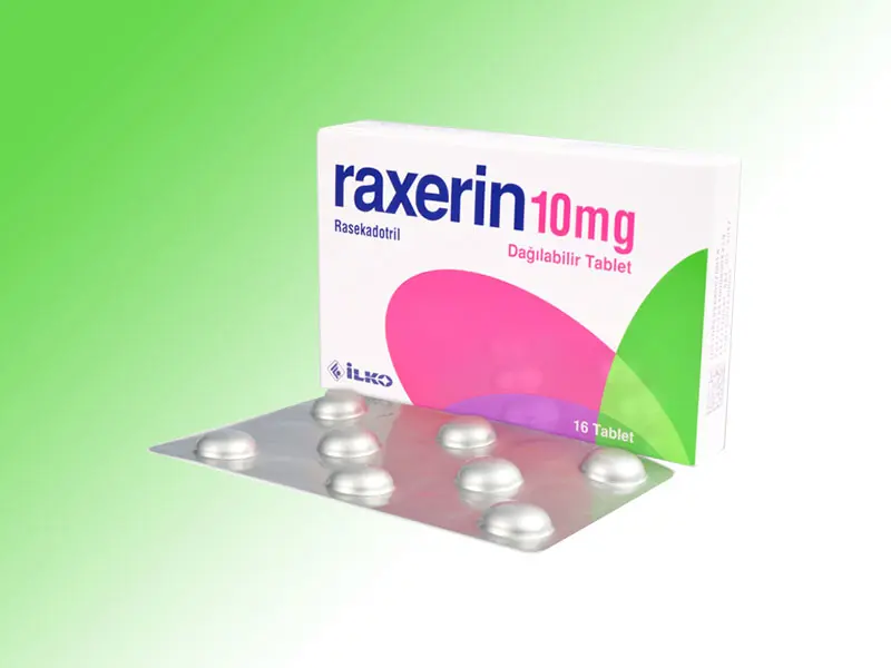 RAXERİN, beyaz renkli, yuvarlak şekilli, suda dağılan tablettir. Her bir tablet etkin madde olarak 10 mg rasekadotril içerir. 16 tabletlik blister ambalajlarda kullanıma sunulmuştur.