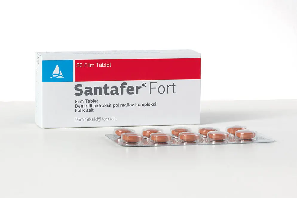 - SANTAFER® FORT, demir III hidroksit polimaltoz kompleksi ve folik asit içeren bir film kaplı tablettir. Her bir film tableti 100 mg Elementer demir’e eşdeğer miktarda demir III hidroksit polimaltoz kompleksi ve 0,350 mg folik asit içeren 30 film tabletlik ambalajlarda piyasaya sunulmuştur. Tabletler, kırmızı-kahverengi, bikonveks, yuvarlak film kaplı tabletler şeklindedir. Ağız yolu ile uygulanarak, doğal olarak vücutta bütün hücrelerde bulunan ve başta kan yapımı ve oksijenin dokulara taşınması gibi hayati öneme sahip birçok fizyolojik olayda önemli rolü olan demir eksikliğinde veya takviye edilmesi gerektiği durumlarda ihtiyacın giderilmesi için kullanılır.