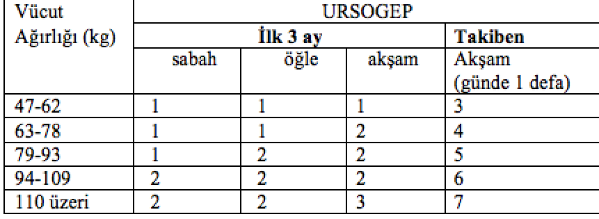 Her kg vücut ağırlığı için günde yaklaşık 10 mg ursodeoksikolik aside eşdeğer olarak :