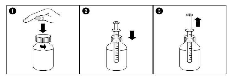 - Pipetteki pistonu yukarıya doğru çekerken doktorunuzun önerdiği dozu karşılayan miligram seviyesine gelinceye kadar pipeti çözelti ile doldurunuz ve pipeti şişeden çıkarınız (Şekil 3).
