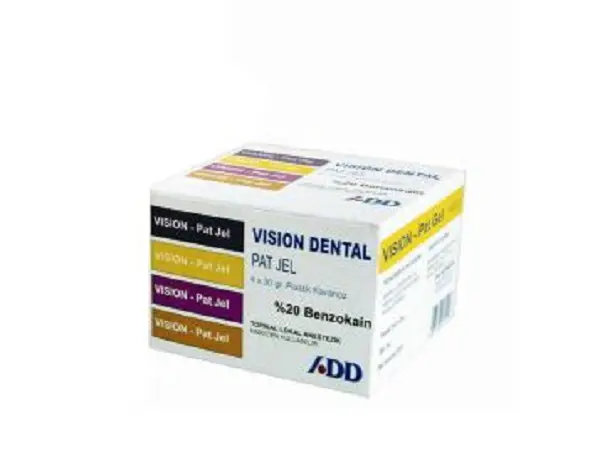 VISION DENTAL PAT JEL , % 20 oranında benzokain içeren 4 X 30 gr.lık plastik kavanoz şeklindeki ambalajlarda satılmaktadır.
