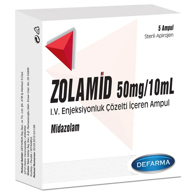 - ZOLAMİD ampul, imidazobenzodiazepin grubu bir benzodiazepindir. Uyku başlatmak (sakinleşme, uyuşukluk veya uykulu durumu) ve heyecan, kas kasılmaları ve spazmları azaltmak için kullanılan hızlı etkili bir ilaçtır. İlaç damar içine enjeksiyon (intravenöz), damla ile (infüzyon), kas içine enjeksiyon (intramusküler) veya rektal uygulama yolu ile uygulanır.
