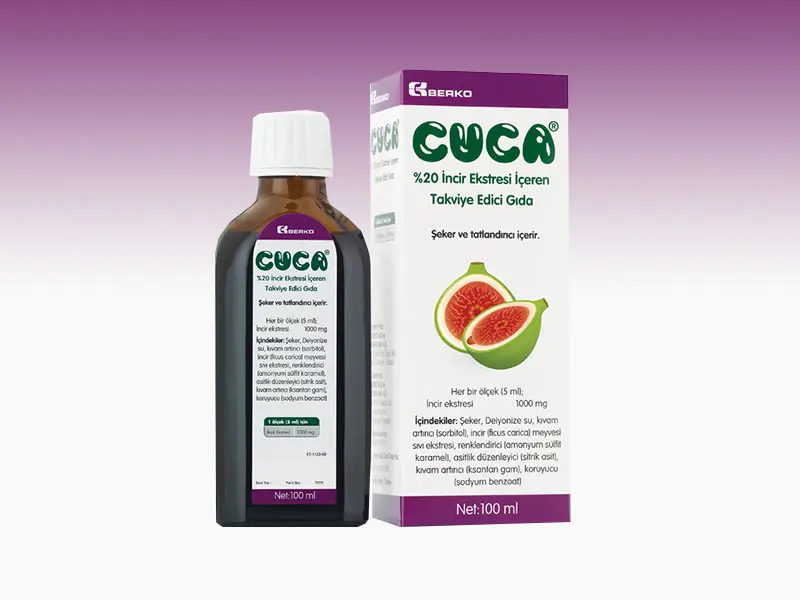 CUCA %20 İncir Ekstresi İçeren Takviye Edici Gıda Her bir ölçek (5 ml); İncir ekstresi 1000 mg İçindekiler: Şeker , deiyonize su, kıvam artırıcı ( sorbitol ), incir (ficus caric...