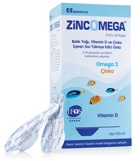 Zincomega Balık Yağı , Multivitamin ve Çinko İçeren Sıvı Takviye Edici Gıda, 100 ml Her 1 ölçek (5 ml); Balık yağı 1750 mg (455,0 mg toplam Omega 3), Çinko 1.88 mg, Vitamin C 7....